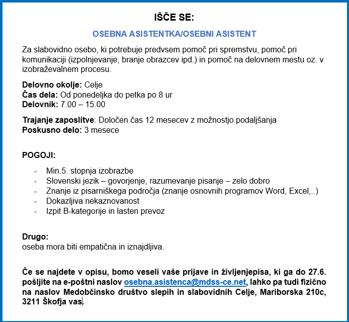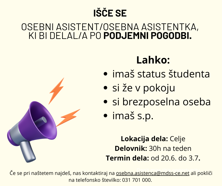 Išče se osebni asistent/osebna asistentka, ki bi delal/a po podjemni pogodbi.